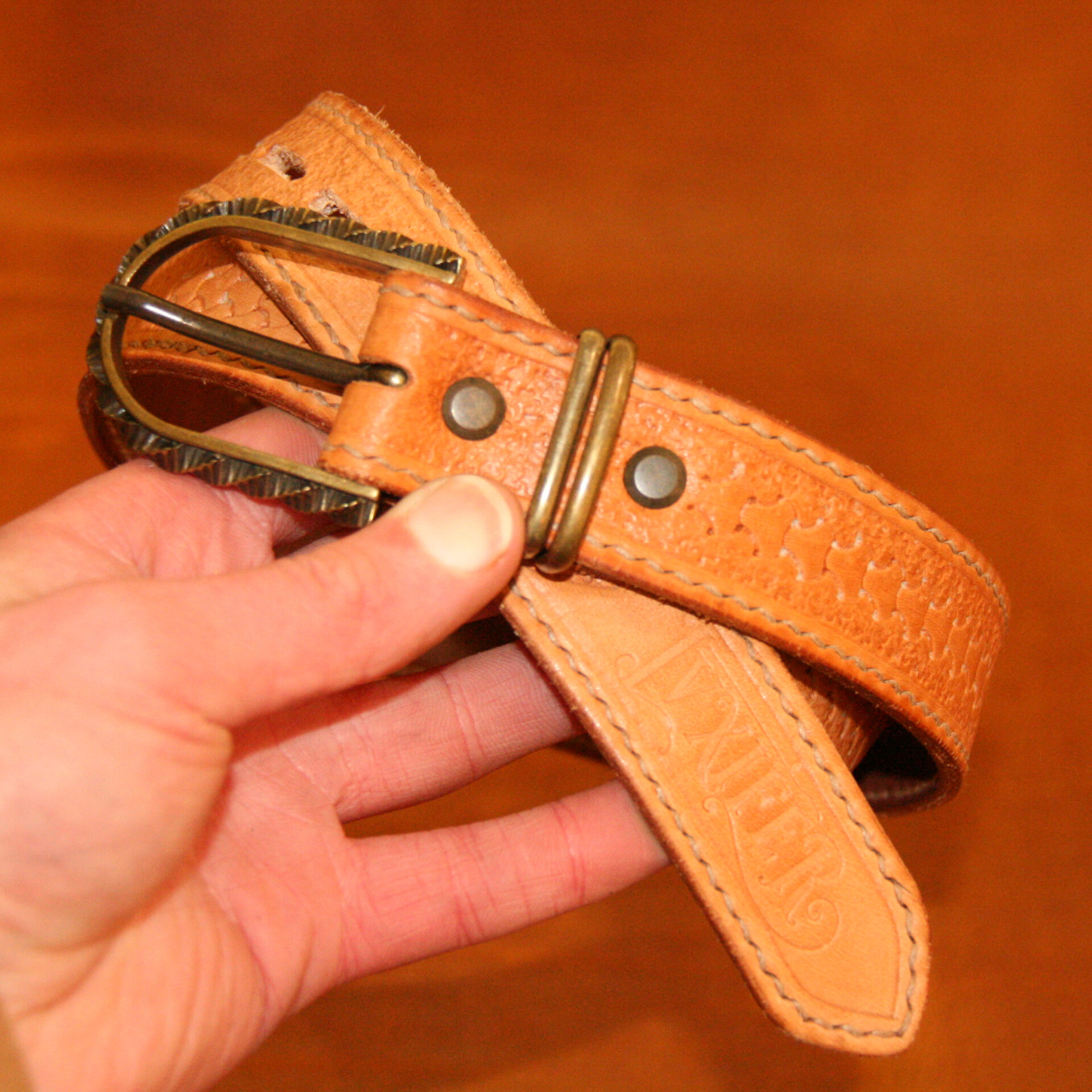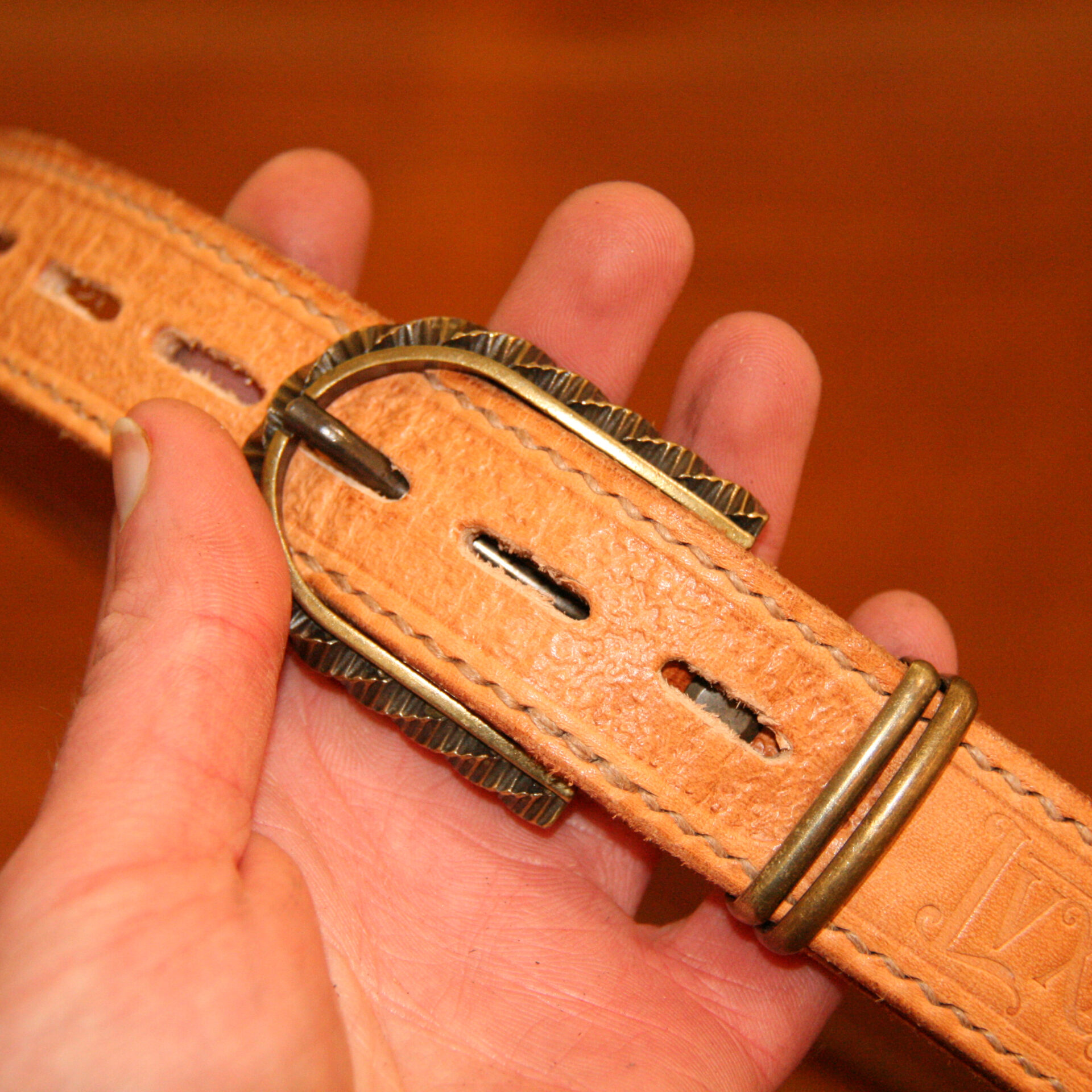 Ceinture à motif en cuir à tannage végétal naturel.